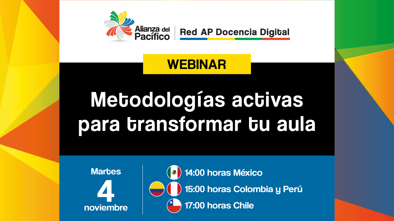 Este martes 4 de noviembre, la Alianza del Pacífico, Fundación Chile y educarchile, realizarán un segundo webinar de la Red AP Docencia Digital, plataforma online desarrollada para fortalecer las competencias digitales de docentes y directivos de la Educación Básica. En esta ocasión la temática apunta al uso de la tecnología para llevar a cabo metodologías activas.